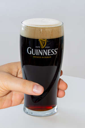 Calgary, Alberta, Canada. March 12, 2021. A person holding a Pint of Guinness Beer on a white background