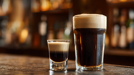 A pint of dark stout beer with a creamy layered shot beside it, styled as a classic Irish Car Bomb cocktail on a wooden bar counter.