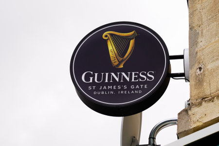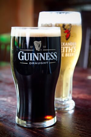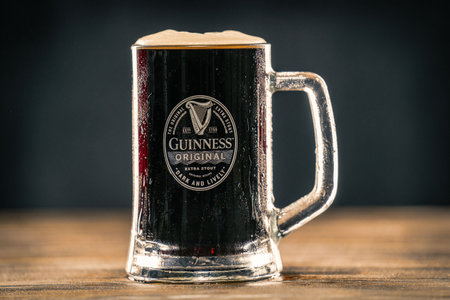 Guinness is a dark Irish dry stout that originated in the brewery of Arthur Guinness at St. Jamess Gate Dublin Ireland, in 1759. UK, Bedford, December 27, 2020
