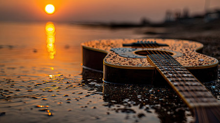 An acoustic guitar rests on a wet, sandy beach. The image captures the instrument's details with water droplets. Warm orange and yellow hues from the sunset create a soft glow. This scene can be used to represent music, relaxation, and artistic concepts. It suggests a peaceful, outdoor setting with potential commercial applications.