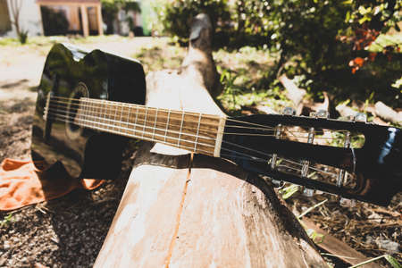 Close Up shot photo of Classic acoustic guitar with filter effect retro vintage style