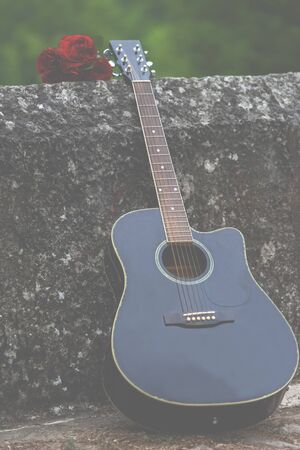 Acoustic guitar and bouquet of red roses on the old bridge wall. Romantic and beautiful scene in nature