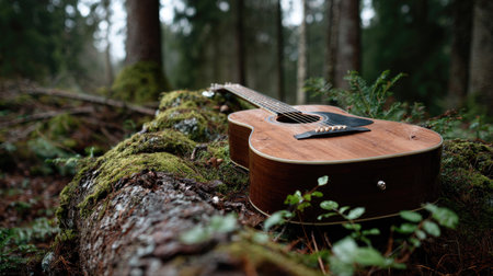 A beautiful acoustic guitar rests on a moss-covered log in a serene forest, surrounded by lush greenery and soft natural light, evoking a peaceful atmosphere.