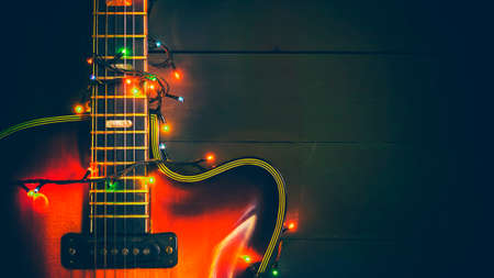Old, jazz electric guitar with a luminous garland. New Year greeting card for musician, guitarist. Festive background.