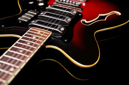 Honey sunburst vintage electric jazz guitar closeup on the black background, with plenty of copy space. Selective focus.