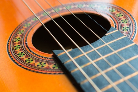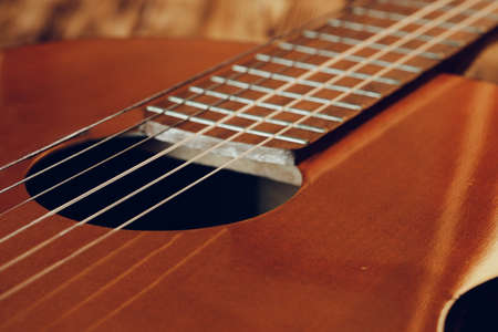 Details of classic acoustic guitar, strings and chords, guitar neck close up
