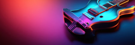 A stunning 3D guitar rests on a flat surface illuminated by vibrant colored lights, highlighting its intricate design and craftsmanship.