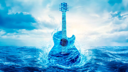 Water composing an acoustic guitar emerges from the ocean waves under a cloudy sky, creating a surreal and artistic representation of music's connection with nature