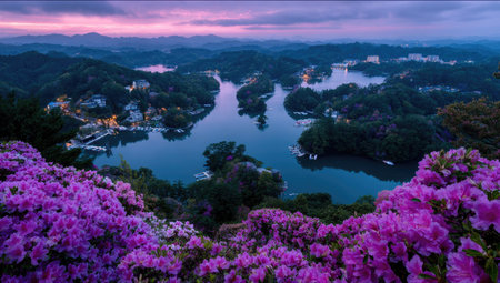 Mountain landscape with pink rhododendron flowers and lake