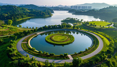 A vast lake features a circular island and a distant city skyline, with lush green hills surrounding it.