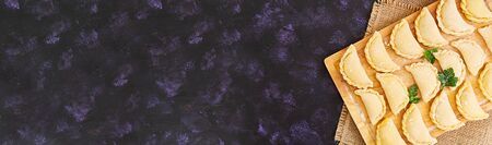 Delicious dumplings with cabbage on dark background. Top view. Banner.