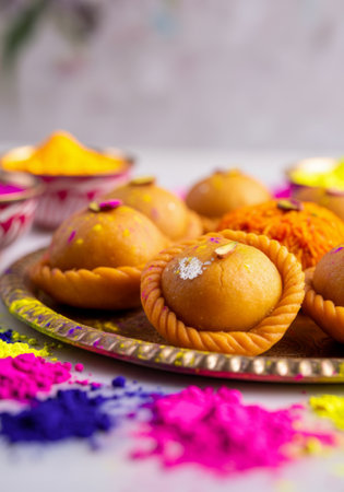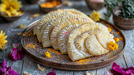 Delicious Indian Holi Festival Sweets on Decorative Plate with Colorful Flower Petals. Concept of Traditional Celebration, Festive Treats.