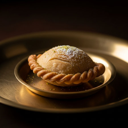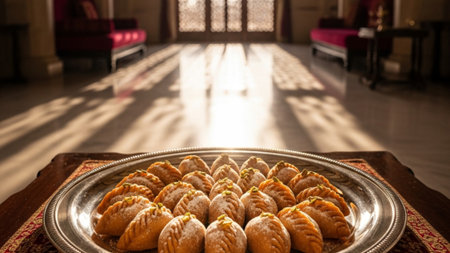 A cinematic wide environmental shot (16:9) capturing a decorative brass plate of Gujiya sweets place