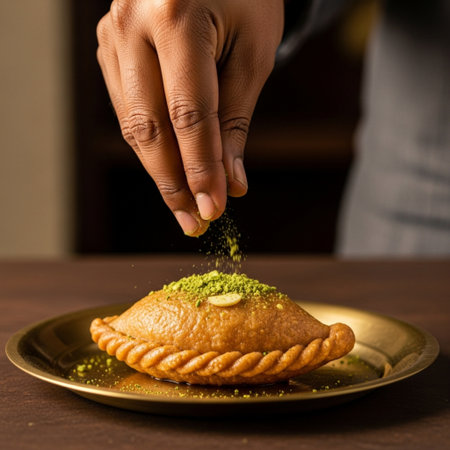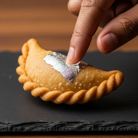 A hero detail shot capturing the intricate process of decorating traditional Indian Gujiya sweets wi