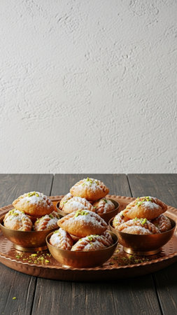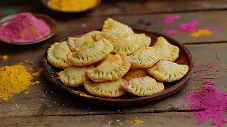 A beautifully arranged plate of golden pastries surrounded by colorful powders, perfect for festive celebrations. Capture the essence of joy and tradition.