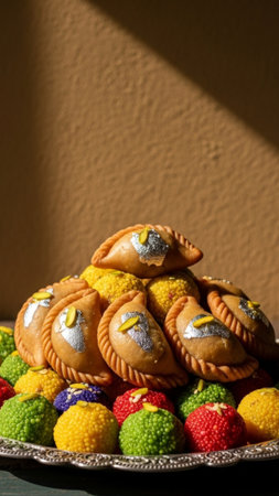 A tall, vertical 9:16 composition featuring a platter of traditional Indian sweets (Gujiya) and a br