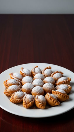 Delightful sweet cookies on a plate served with powdered sugar at a cozy kitchen setting