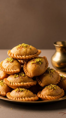 chandrakala indian sweet dish stacked with cashew and pistachio garnish