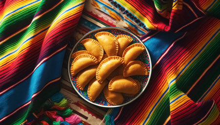 A flat lay view of golden-brown empanadas on a plate, set against the backdrop of a vibrant serape, highlighting the colorful and festive nature of this traditional dish. The natural light enhances the contrast between the crispy crusts and the vivid, striped fabric, creating an inviting and culturally rich presentation.