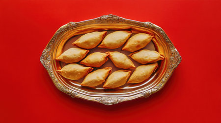 A beautiful arrangement of golden-brown savory pastries on a vintage silver platter, set against a bold red background, perfect for culinary displays.