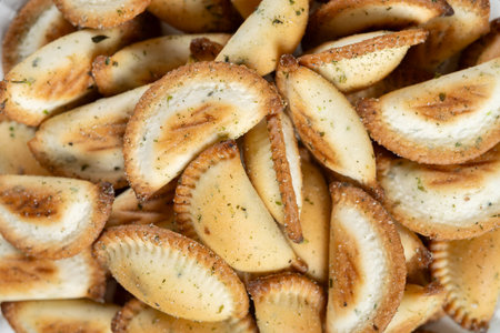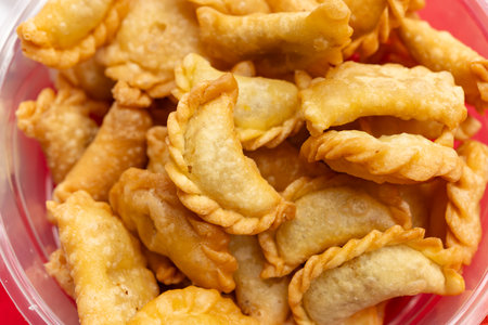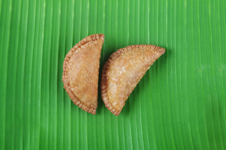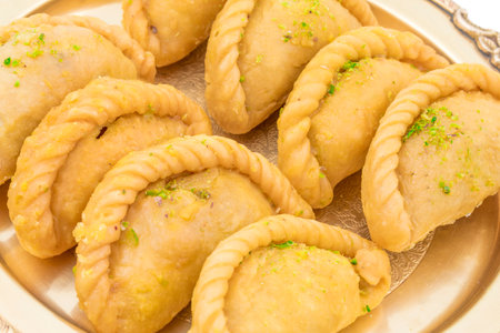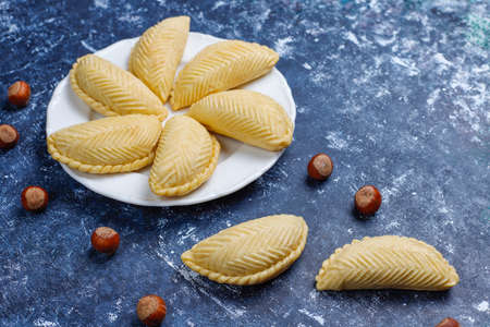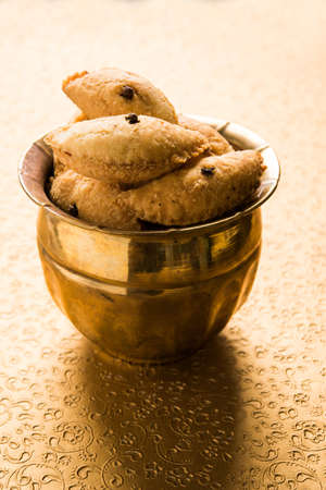 Stock Photo of Karnaji or gujia is a sweet dumpling made from maida and stuffed with khoya . It is common sweet in north India and these are usually on diwali or festival time, selective focus