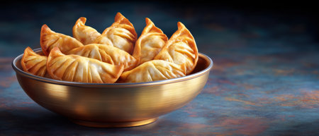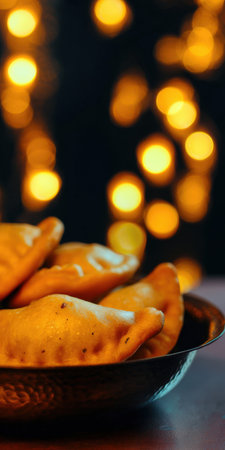 Gujiya sweet pastries are arranged in a bronze bowl, illuminated by warm golden bokeh lights, creating a festive and celebratory atmosphere, perfect for Indian festivals
