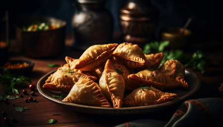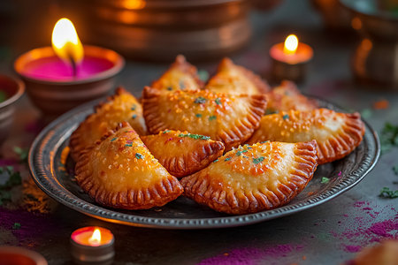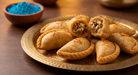 Delicious indian holi snacks with gujiya and tandoori spices. concept of traditional cuisine, cultural celebration, festive flavors.