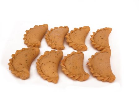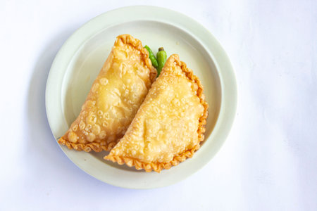 Curry puff on a white plate. Curry puff, snack food, pastries, stuffed buns.