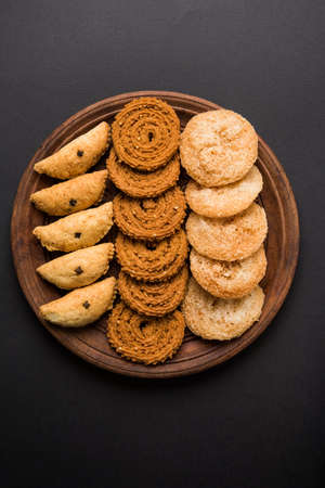 stock photo of Indian festival or diwali food called chakli, anarsa and karanji or Gujiya, selective focus