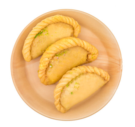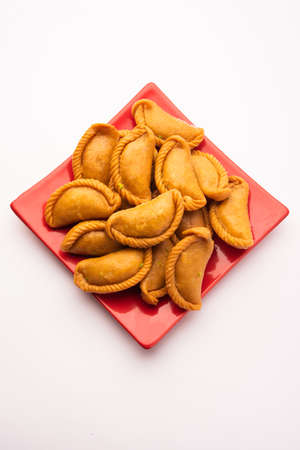 Gujiya or gujia or karanji - sweet dumplings made during the festival of holi and diwali, served in a plate. selective focus