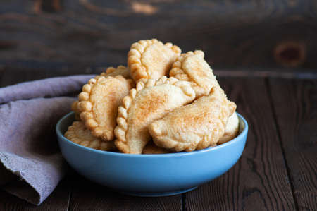 Freshly fried hand pies with meat in a bowl on a wooden background. close up.