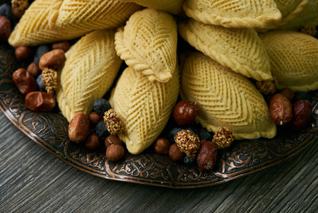 Novruz tray with traditional Azerbaijan pastries shekerbura on wooden table background, top view