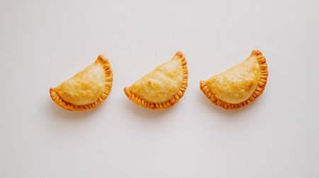 Three golden empanadas arranged on a clean white background, showcasing their crispy texture and inviting appearance. Perfect for food photography.