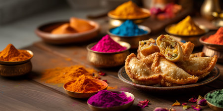A festive Holi celebration setup with Indian snacks like gujiya, mathri, and colorful powdered dyes.