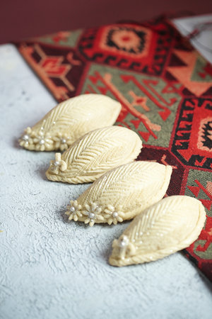 Azerbaijan national pastry shakarbura on white plate on dark background ,top view,spring new year celebration Novruz holiday.