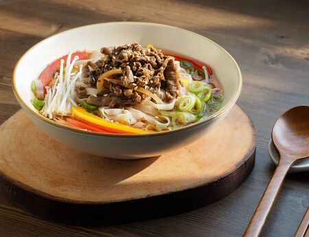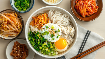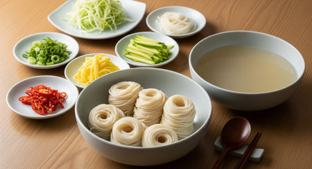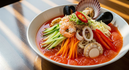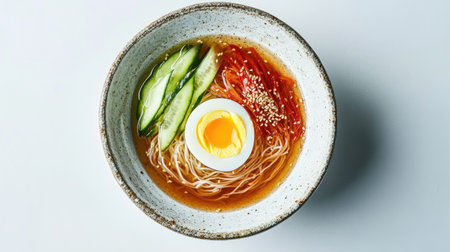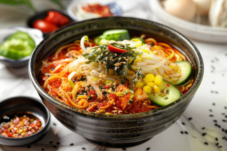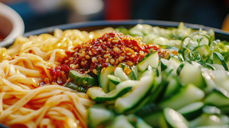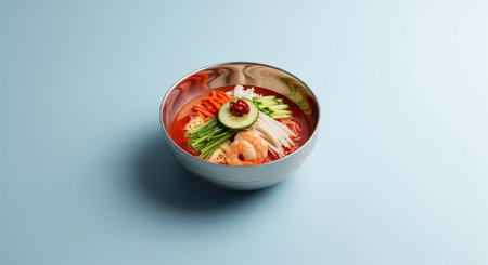 AI Generated. Cold Noodle Soup with Fresh Vegetables and Kimchi featuring Beef