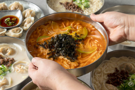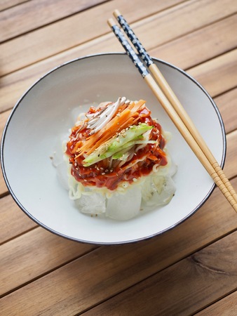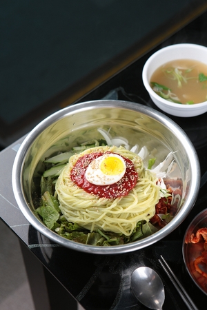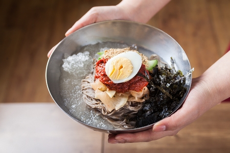 Korean cold noodle makguksu with various vegetables and spicy seasoning served with two hands