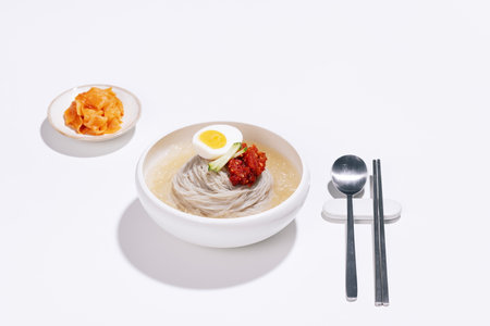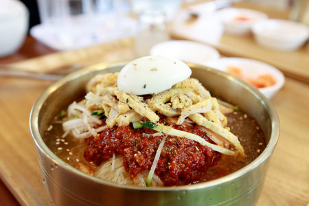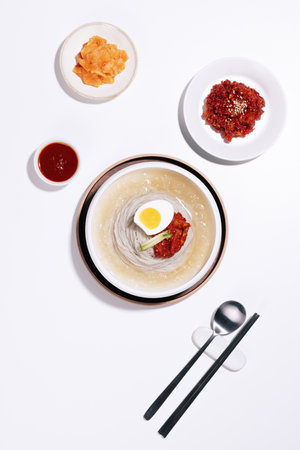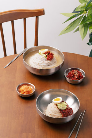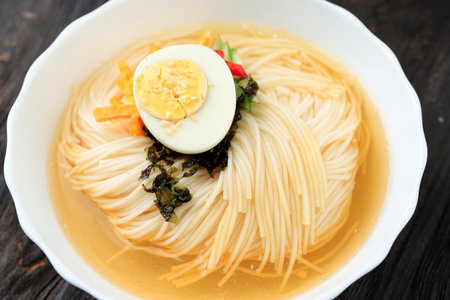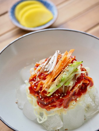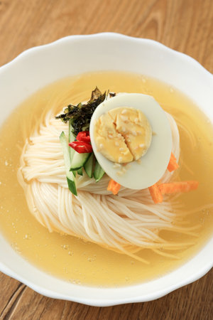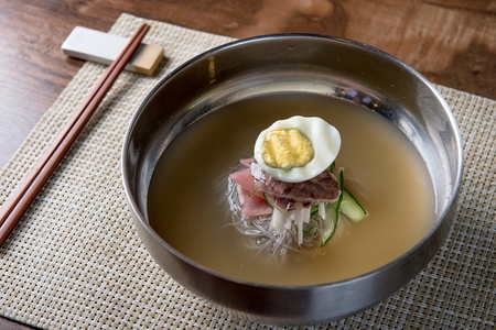 Korean food Cold Noodles, Mul-naengmyeon, close-up shot