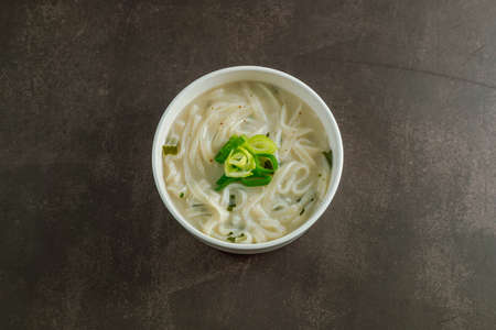 Korean cold noodle with soy soup with no toppings, close-up shot