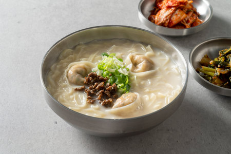 Korean traditional food Sliced Rice Cake Soup ,Tteok and Dumpling Soup or Manduguk. Copy Space for Text