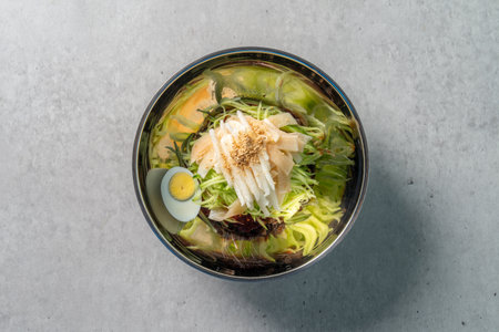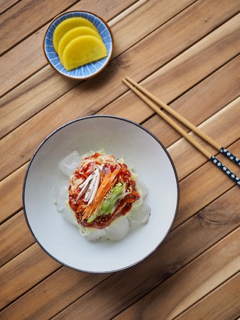 Korean food Cold Noodles with vegetables, Mul-naengmyeon, top view