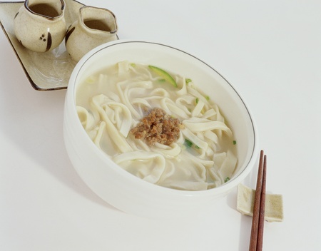 Chopsticks picking up Dak-kalguksu, korean noodle soup dish with chicken, in white bowl