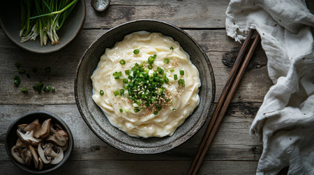 An elegant display of ramen garnished with sesame seeds, sliced scallions, and a drizzle of chili oil, set against a clean, white background