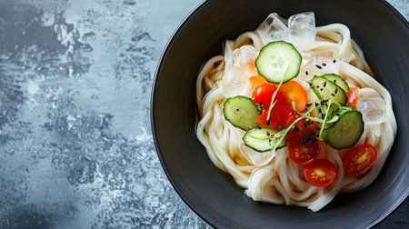A beautifully presented bowl of cold udon noodles topped with sliced cucumbers, cherry tomatoes, and a drizzle of soy sauce, served with ice cubes in a minimalist setting.