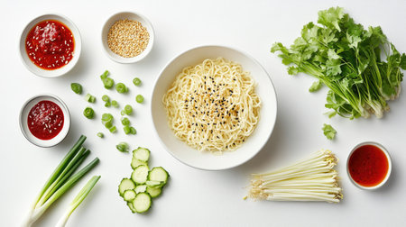 Fresh ingredients are artfully arranged for a vibrant noodle dish. Highlights include carrots, eggs, herbs, sesame, and various spices for culinary inspiration.
