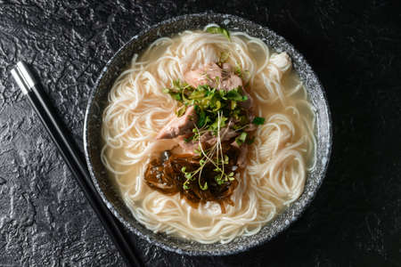 macro shot of rice noodles soaked in pho broth, created with generative ai