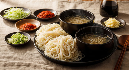 An artistic arrangement of fresh soba noodles, accompanied by dipping sauces and garnishes like scallions and wasabi, displayed on a rustic wooden board.