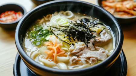 Korean cuisine Sagol soup - cow bone soup with carrot, egg and dried seaweed powder toppings, chopsticks holding Kalguksu, noodle from the soup