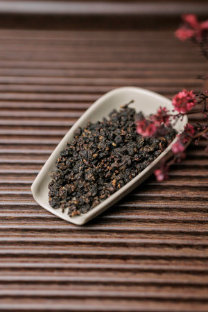 A Beautiful Presentation of Dried Tea Leaves on a Serving Dish Featuring Cherry Blossom Accents