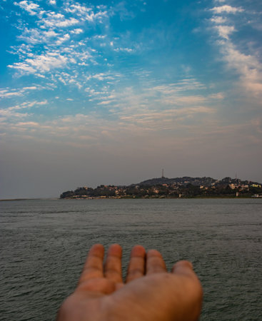 girl posing her hand towards island at ship deck with sunset orange sky image is taken from flat angle.
